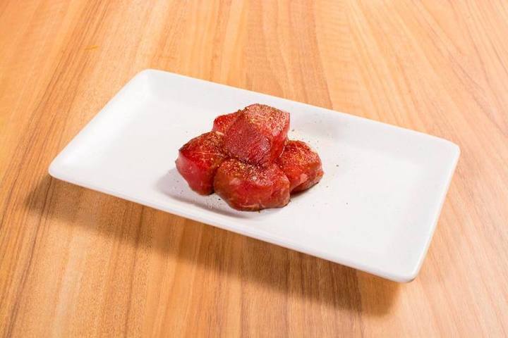 食べやすくサイコロ状にカットしたラム肉を、さっと表面を焼き上げてレアで味わうメニューです。