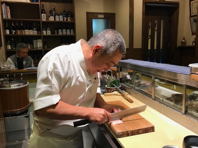 コースには、ポワレで調理したハモをネタにした温かい握りも含めました。この道一筋41年の店主がお勧めします。