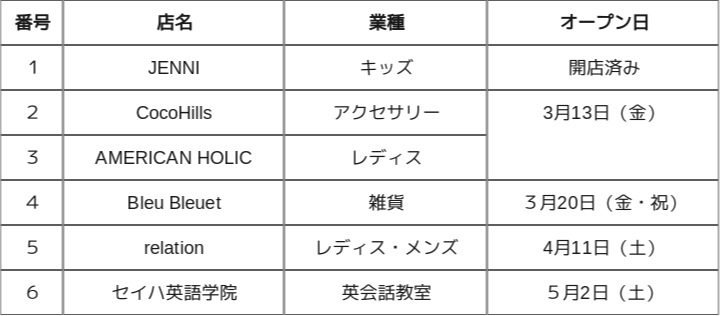 ・「地元の素敵なお店」をコンセプトに季節ごとに居心地の良さを感じさせるようなナチュラルな生活雑貨を中心に取り揃える「BleuBleuet」、最新の流行を発信するアクセサリーやバッグ・雑貨を取り扱う「CocoHills」が新規出店いたします。