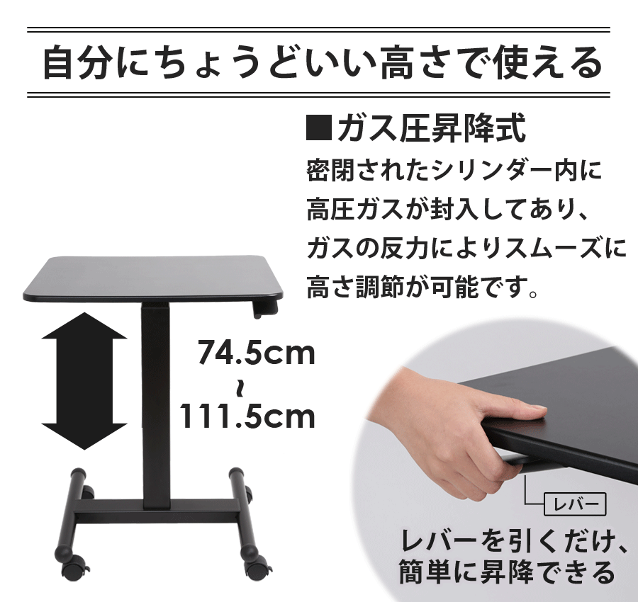 ガス圧シリンダー内蔵でスムーズな昇降が可能。イスに座った状態から、ワンタッチで立ち仕事へ切り替えることができます。