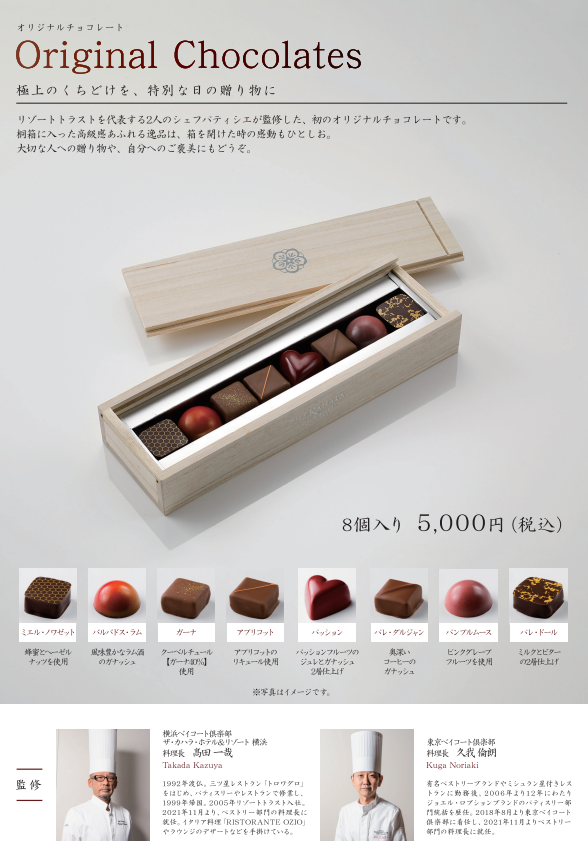 リゾートトラストを代表する2人のシェフパティシエが監修した、初のオリジナルチョコレートです。桐箱に入った高級感あふれる逸品は、箱を開けた時の感動もひとしお。 大切な人への贈り物や、自分へのご褒美にもどうぞ。