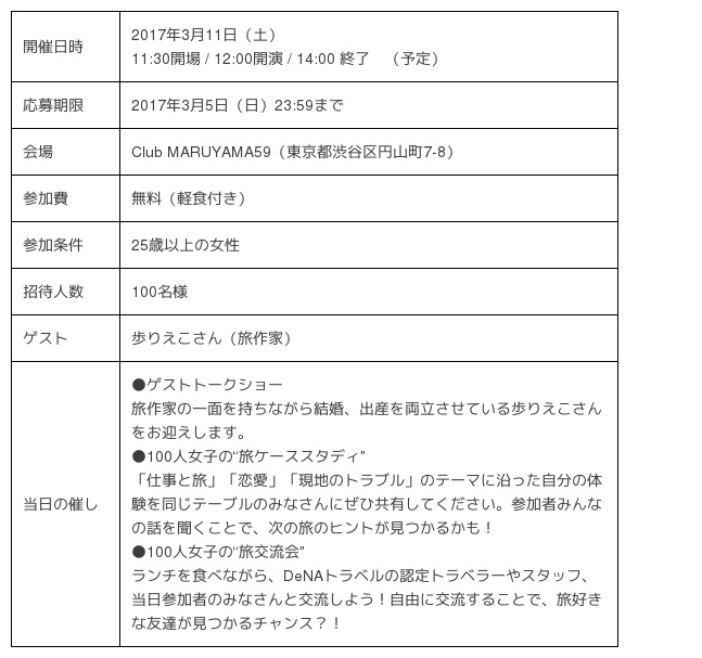 オンライン総合旅行サービス「DeNAトラベル」(http://www.skygate.co.jp)を運営する株式会社DeNAトラベル(本社:東京都新宿区、代表取締役社長:中野 正治、以下DeNAトラベル)は、自社初となるDeNAトラベル認定トラベラー(以下、認定トラベラー)との共同主催イベント「大人になったからできる旅」をClub MARUYAMA59にて2017年3月11日(土)に開催することを決定しました。それに先がけ、本日2017年2月20日(月)から参加申込の受付を開始します。