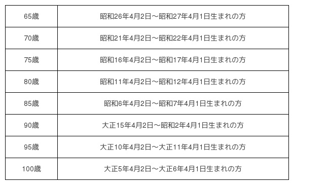 平成28年度に65歳、70歳、75歳、80歳、85歳、90歳、95歳、100歳の誕生日を迎える方が対象となります。なお、平成27年度から平成30年度までの間は、その年度に65歳、70歳、75歳、80歳、85歳、90歳、95歳、100歳の誕生日を迎える方が対象となり、平成31年度からは、接種日当日に65歳である方が対象となります。 ?