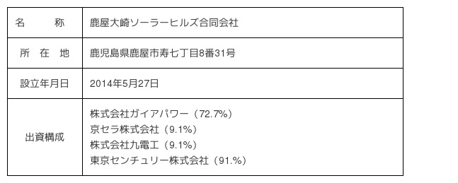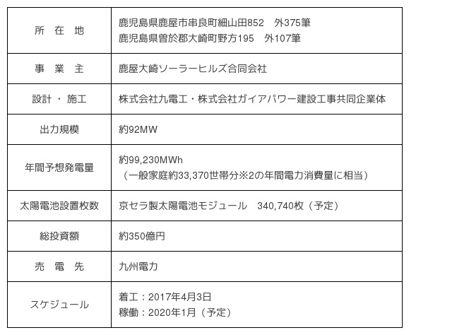 本事業は、鹿屋大崎ソーラーヒルズ合同会社が事業運営を行い、九電工・ガイアパワー建設工事共同企業体が発電所の設計・施工・維持管理を行います。また、京セラが太陽電池モジュールの供給、東京センチュリーがファイナンスとそのアレンジメントをそれぞれ担います。総投資額は約350億円を見込み、2020年1月の稼働開始を計画しております。