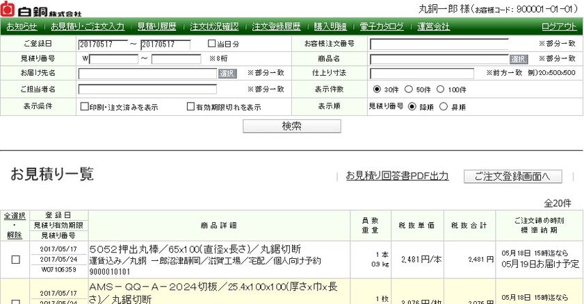 同社では、既存のお客様については、インターネットで24時間・365日いつでも材料が見積もり・発注できる「白銅ネットサービス」を展開し、アルミニウム・銅・ステンレス・プラスチックなどの幅広い材料の即納サービスを行ってきました。土曜日受注・一部商品のミルシート即日発行など、白銅ネットサービス独自のサービスを追加し、顧客ニーズに応えてきました。