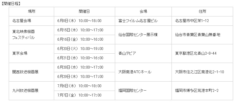 また、「東北映像機器フェスティバル」(6月15日・16日)、「関西放送機器展」(6月28日・29日)、「九州放送機器展」(7月6日・7日)にも出展します。