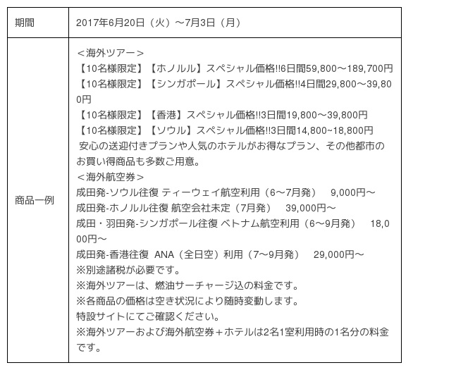 本キャンペーンでは、6〜10月出発の海外ツアーや海外航空券を特別価格で販売します。第2弾の商品に加え、今回は定番ビーチリゾートのホノルルやアジア注目都市の人気ホテルにお得に泊まれるツアーなどを取りそろえ、各先着10名様限定で、東京発ホノルル6日間59,800〜189,700円、シンガポール4日間29,800〜39,800円、香港3日間19,800〜39,800円、ソウル3日間14,800〜18,800円等のお買い得商品を用意しました。