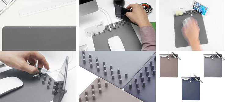 ケーブル、名刺、メモ、スマートフォン、USB、SDカードなど、何でも挟んで片付けが楽になります。すぐ手の届く場所にあるから、モノ探しに時間をかける必要がありません。使い勝手抜群の大きさでデスクのサイズを考えずご使用できます。最適化されたサイズや高さ、ほどよい配列をもつ突起で多様なモノを色んな角度で安定的に挟みます。TPU素材に表面加工を加え、マウス操作も思いのまま。スタイリッシュなデザイン、使い勝手を考えた機能とサイズ、選べる3色展開