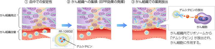 「FF-10832」は、血中での薬剤の消失半減期(*3)が非常に短い「ゲムシタビン」を、当社のナノ分散技術や解析技術、プロセス技術などを用いてリポソームに内包することにより、血中での薬剤の安定性を大幅に高めています。さらに、EPR効果を発揮できるようリポソームを約80nmの均一なサイズに設計することで、薬剤のがん組織への集積を向上。膵臓がん細胞(ヒト由来)を移植したマウス実験では、「FF-10832」が、がん組織に既存の「ゲムシタビン」よりも多く集積し、長時間滞留することが確認できました。