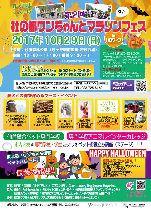 杜の都ワンちゃんとマラソンフェス実行委員会(代表企業:株式会社シークエンス)は、仙台初のドッグマラソンフェス「第2回 杜の都ワンちゃんとマラソンフェス in ハロウィン」を台原森林公園 旭ヶ丘駅前広場 特設会場にて10月29日(日)に開催します。