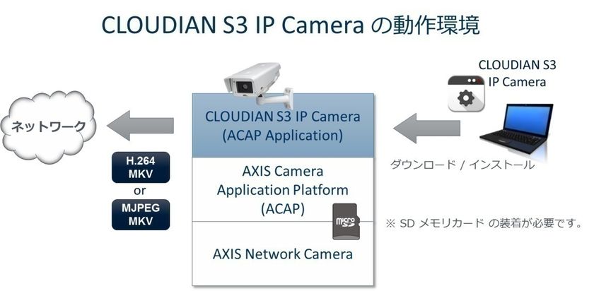 『CLOUDIAN S3 IP Camera』は、既存のアクシスのネットワークカメラにダウンロードしてインストールすることができるアプリケーションです。クラウディアンがアクシスのアプリケーション開発パートナープログラムを通じて、アクシスのACAP(AXIS Camera Application Platform)に対応する形で開発したものです。