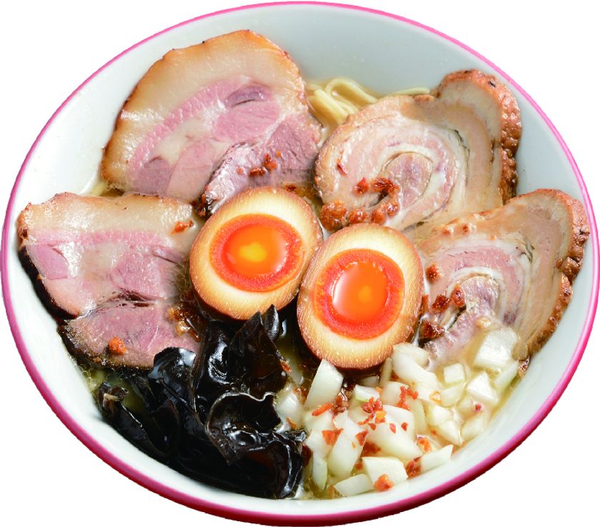 豚バラ肉と肩ロースの2種類のチャーシュー。半熟味玉ときざみ玉ネギが豪華さを演出します。