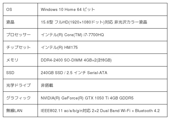 CPUにはインテル(R) Core(TM) i7-7700HQ、グラフィックアクセラレーターにはNVIDIA(R) GeForce(R) GTX 1050 Tiを搭載しており、ゲームプレイには充分なスペックを備えております。