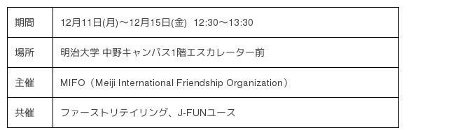 明治大学公認サークル「MIFO(Meiji International Friendship Organization)」は、『全商品リサイクル活動』を12月11日(月)〜12月15日(金)に中野キャンパス1階エスカレーター前で実施します。