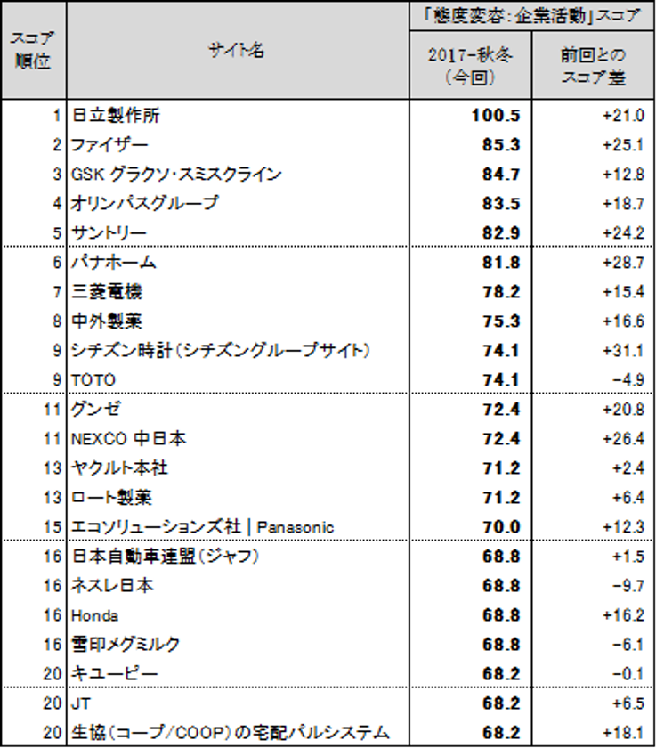 表1●「態度変容:企業活動」スコア ランキングトップ20
