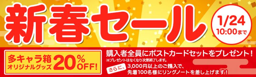 新春セール期間中、商品をご購入いただいた方全員に、多キャラ箱特製ポストカードセットをプレゼントいたします(※プレゼントはなくなり次第終了します)。