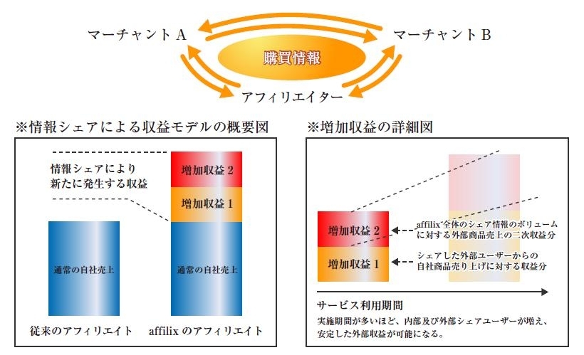 また、情報資産の共有にともなって、情報資産を所持するマーチャントに情報が活用されるとアフィリエイト報酬(二次収益)が発生するという独自の収益モデルを採用している業界初の画期的なビジネスモデルです。