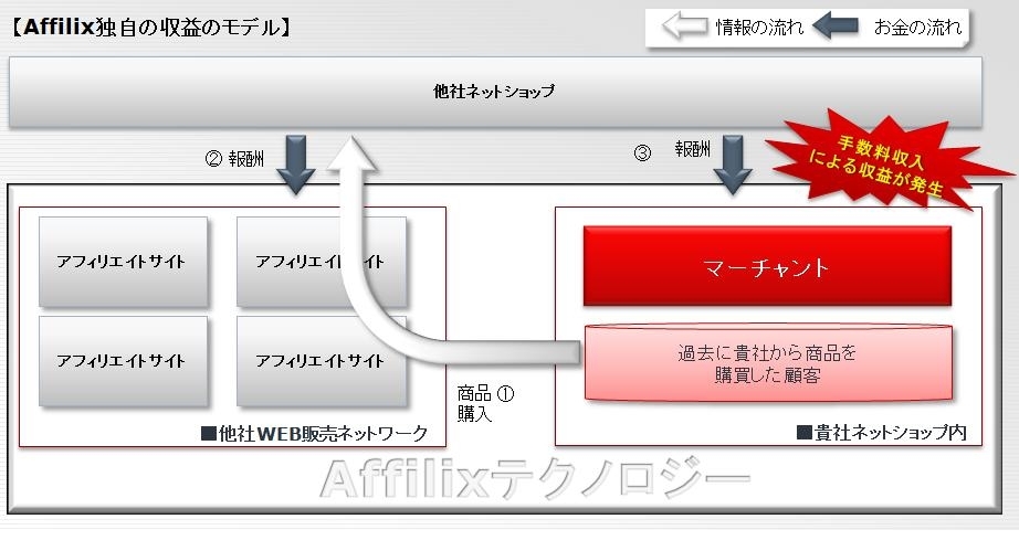 また、保有マーチャント側には紹介料(アフィリエイト報酬)として二次収益が発生し、継続期間が長く保有情報が多いほど、安定した収益基盤を造り上げることが可能となります。このビジネスモデルは特許出願済みのアフィリックス独自の仕組みです。(特願2010-009749)