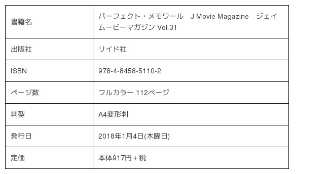 株式会社リイド社(所在地:東京都杉並区、代表取締役社長:齊藤哲人)は2017年1月4日(木曜日)に、映画を中心としたエンターテインメントビジュアルマガジン『パーフェクト・メモワール J Movie Magazine ジェイムービーマガジン Vol.31』を刊行いたします。