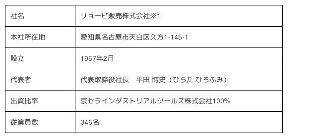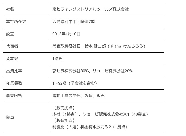 京セラ株式会社(社長:谷本 秀夫、以下:京セラ)は、2017年10月31日(火)に発表いたしましたとおり、リョービ株式会社(社長:浦上 彰、以下:リョービ)との電動工具事業の取得に関する株式譲渡契約に基づき、リョービが設立した新設会社の株式を京セラが80%取得し、「京セラインダストリアルツールズ株式会社」として事業を開始しましたのでお知らせいたします。なお、新会社の概要は以下の通りです。