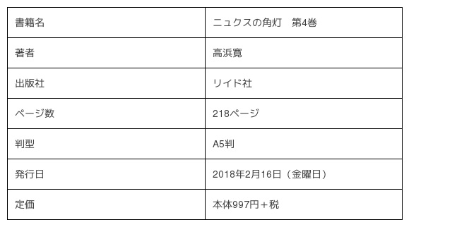 株式会社リイド社(所在地:東京都杉並区、代表取締役社長:齊藤哲人)より2018年2月16日(金曜日)に、著者・高浜寛、『ニュクスの角灯 第4巻』を刊行いたします。