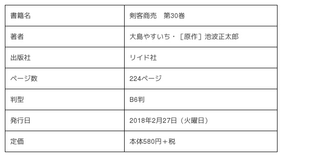 株式会社リイド社(所在地:東京都杉並区、代表取締役社長:齊藤哲人)より2018年2月27日(火曜日)に、著者・大島やすいち/原作・池波正太郎『剣客商売 第30巻』を刊行いたします。
