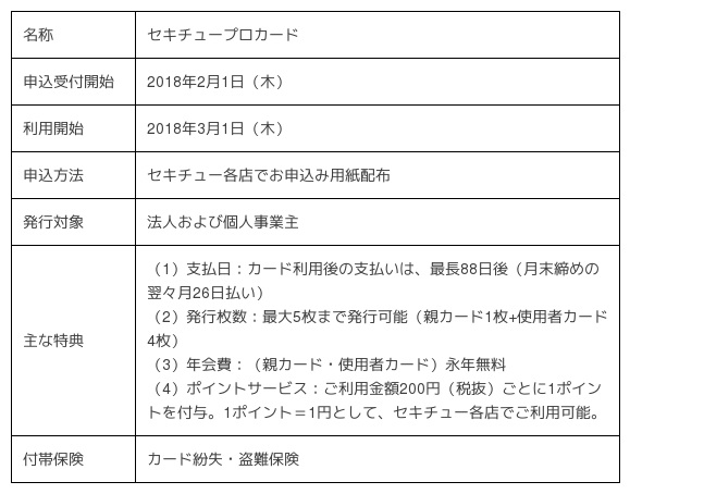 株式会社セキチュー(本社:群馬県高崎市/代表取締役社長 関口 忠弘、以下「セキチュー」)と三井住友フィナンシャルグループの株式会社セディナ(東京本社:東京都港区/代表取締役社長 中西 智、以下「セディナ」)は、これまでも個人のお客さま向けクレジットカードの発行で提携していますが、この度、事業者専用クレジットカード「セキチュープロカード」を発行しますので、お知らせいたします。なお、各店舗でのご利用開始は3月1日からとなります。