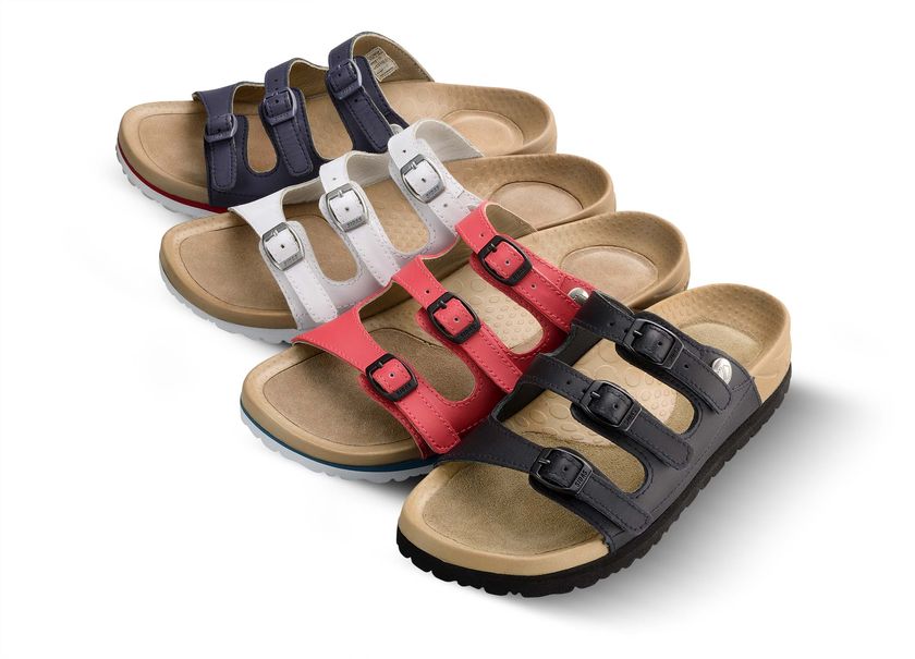 脱ぎ履きが楽なスリップオンタイプでありながら、3ストラップで足を適度にホールドするため、歩行時に脱げにくく歩きやすい。
