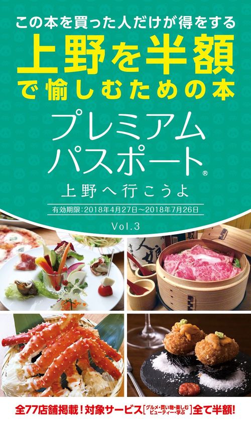 株式会社アプローチ・ハル(所在地:東京都足立区、代表取締役社長:下川 高志)は、パンダのシャンシャン誕生および国内外からの観光客で沸く上野エリアにおいて、地域企業と消費者が繋がる体験型書籍「プレミアムパスポート〜上野へ行こうよ〜Vol.3」を2018年4月27日に発売します。本書は掲載店舗数77店舗、総額30万円以上のプレミアム体験。従来の情報を伝えるグルメ・ガイド本とは異なり、読者のお得感はまさにプレミアム。この本を買った人だけが得をする、対象サービスの全てが半額以下のスペシャルクーポンブックです。