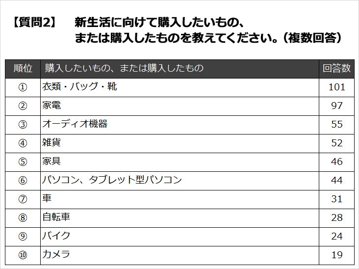 春の装いのための衣類・バッグ・靴類、家電やオーディオ機器、家具など、心機一転、この春何か新しいものを手に入れたい、新しいものに切り替えたいという気持ちが表れています。