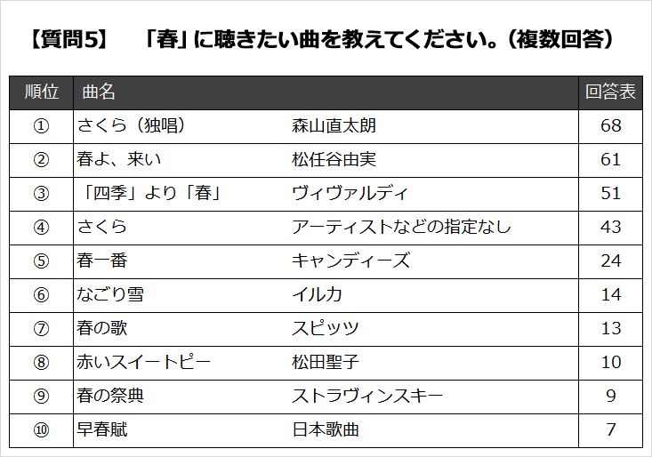 第1位は「さくら(独唱)」(森山直太朗)、2位は「春よ、来い」(松任谷由実)、3位は「四季」より「春」(ヴィヴァルディ)でした。4位は、アーティストなどの特定はない記述、「さくら」や「さくらに関連した曲」などの回答が多くみられました。