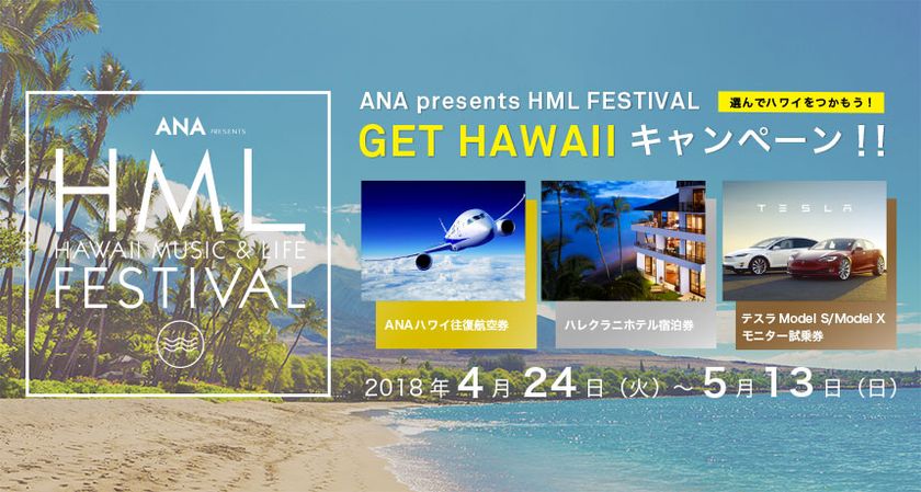 4月28日から始まるハワイの音楽とライフスタイルを体験できるイベント、ANA presents HML FESTIVAL(主催:HML FESTIVAL実行委員会)の開催を祝して、ハワイ行きの往復航空券など豪華賞品が当たる「GET HAWAII〜選んでハワイをつかもう〜」キャンペーンの応募受付が2018年4月24日(火)から始まります。