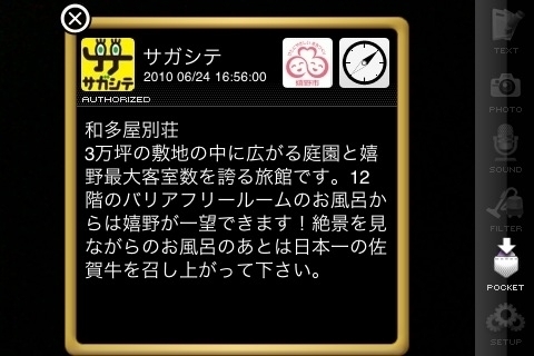 嬉野市(佐賀県嬉野市)では、バリアフリーの視点から選ばれた市内の公共施設、宿泊施設などを、iPhoneアプリ「セカイカメラ」のエアタグを通じ、7月16日(金)より情報発信することになりました。