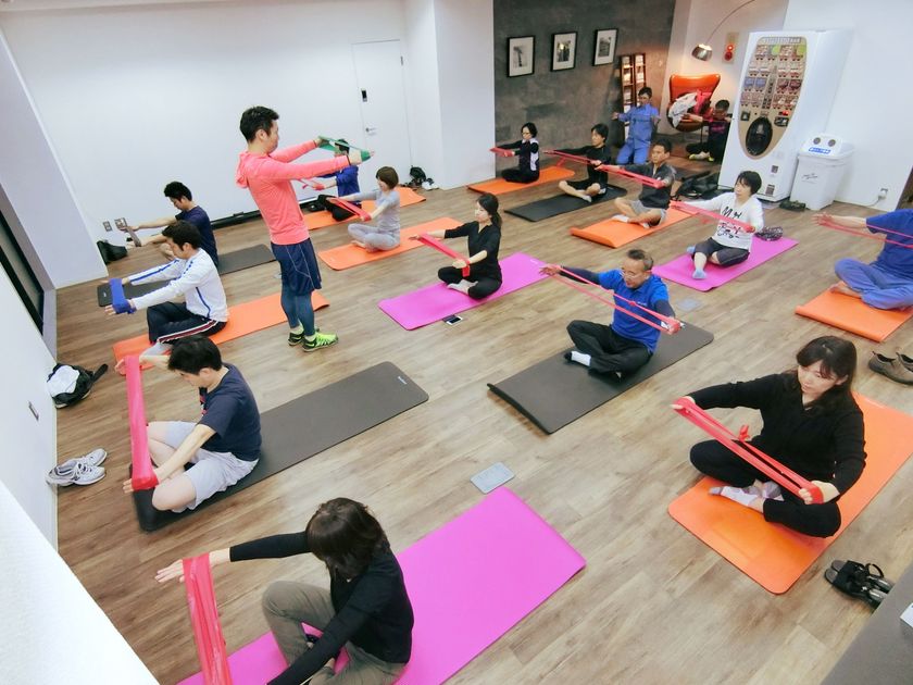 毎週金曜日の就業時間終了後の1時間、本社1階会議室で「全体トレーニング」も実施しています。ストレッチを中心とした強度の低いトレーニング、筋トレを中心とした強度の高いトレーニング、さらにボクシングミットを利用したボクササイズ、リラックスを目的としたリラクゼーション、ヨガなど、飽きがこないよう、様々なトレーニングを実施しています。