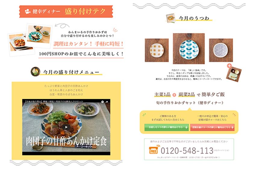 「簡単×おいしい×健康」をテーマにした宅配食を手がける「わんまいる」(運営会社:株式会社ファミリーネットワークシステムズ 本社:大阪市北区 代表取締役社長:堀田 茂)は、5月より自社サイトの新コンテンツとして、100円ショップの器で『健幸ディナー』を簡単に盛付ける1分動画の配信を開始いたします。