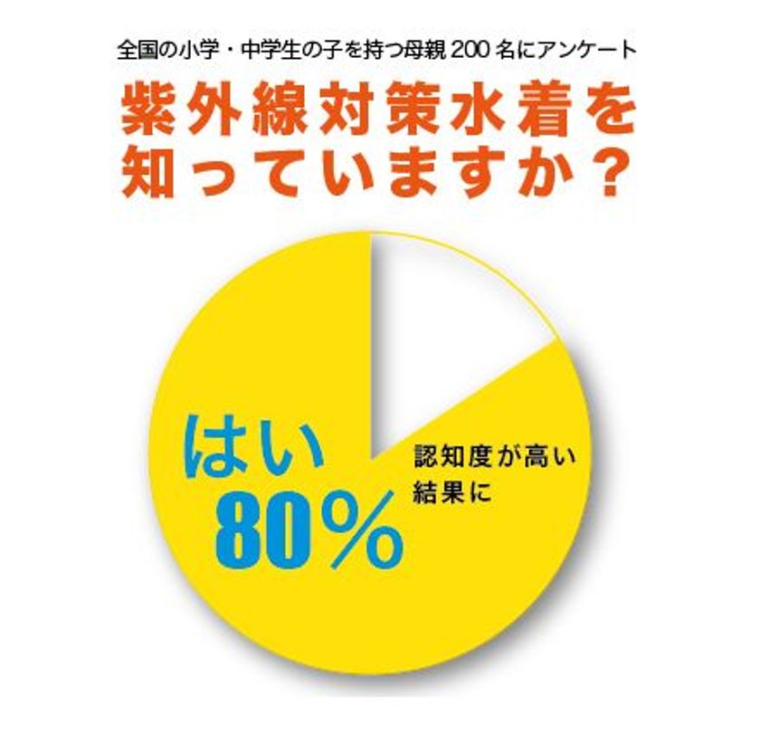 水泳用品メーカーのフットマーク株式会社(本社:東京都墨田区、代表取締役社長:三瓶 芳)は、小学1年生から中学3年生までの子どもを持つ母親200名に、「わが子についての水泳授業における紫外線の認識調査」を実施いたしました。紫外線意識の高まる昨今、学校のプール授業の場面でも使用の普及が広がる「『紫外線対策水着』を知っていますか?」については80%の母親が「はい」と回答。認知度の高さがうかがえました。紫外線対策水着とは、紫外線対策や露出軽減を目的に水着の上からでも着られるシャツ型の水着のことで、特に九州や関西方面では年々使用が盛んになってきています。