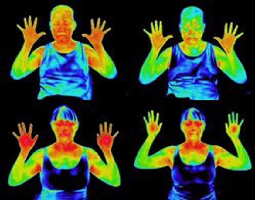 ● 温度28℃/しつど85%で皮膚温度の上昇がみられた状態から、(温度は28℃のまま)しつどを60%に減少させると12名中10名で顕著に手部や顔部の皮膚温度が低下しました。