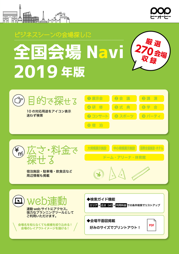 イベントビジネスの専門出版社である株式会社ピーオーピーは6月30日(土)、47都道府県の展示・コンベンション・会議施設、ホテルやアリーナ・ドームなど、イベント会場を網羅した『全国会場Navi 2019年版』を発売するにあたり、予約受付を開始しました。