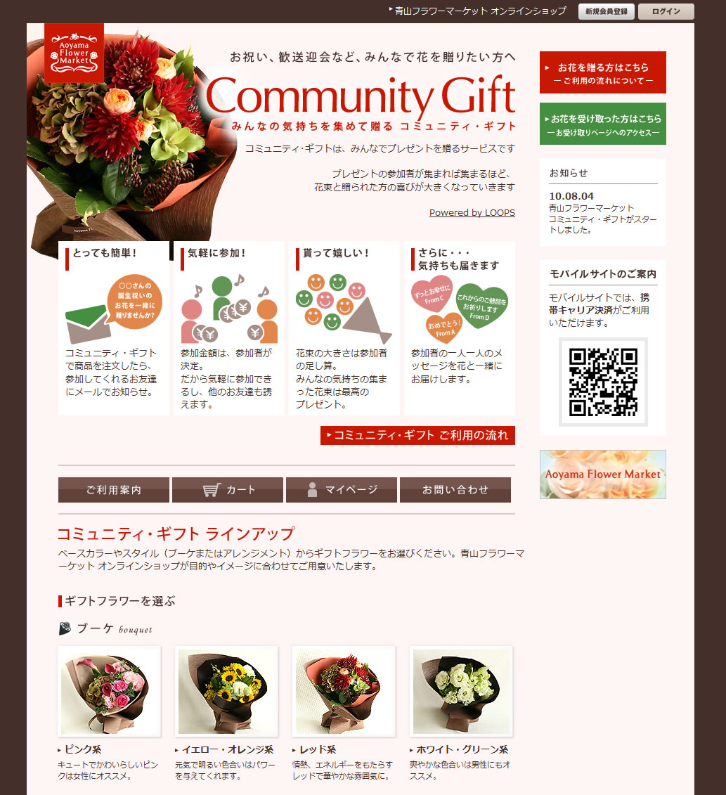 株式会社LOOPS(本社:東京都港区、代表取締役:金内 好宏、以下 LOOPS)は、株式会社パーク・コーポレーション(本社:東京都港区、代表取締役:井上 英明、以下 パーク・コーポレーション)が運営する青山フラワーマーケットとのコラボレーションにより、2010年8月4日より『青山フラワーマーケット コミュニティ・ギフト』をスタートいたしました。