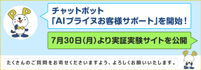 「AIプライヌお客様サポート」は、お客様の質問を蓄積し、分析、学習を繰り返すことで、より適切な回答が導き出せるよう、2018年7月30日(月)より実証実験サイトを公開し、正式サービス開始に向けてさらなる品質の向上に努めてまいります。なお、チャットボット「AIプライヌお客様サポート」の正式サービス開始は、2018年9月3日(月)を予定しております。