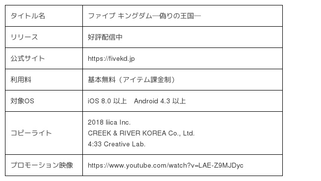 株式会社クリーク・アンド・リバー社の韓国現地法人CREEK & RIVER KOREA Co., Ltd.と株式会社リイカは本日8月23日(木)、スマートフォン(スマホ)専用RPG『ファイブキングダム―偽りの王国―』の配信を開始いたしました。また、4月19日(木)より開始した事前登録においては、おかげさまで8月20日(月)に事前登録者数80万人を突破いたしました。是非、『ファイブキングダム―偽りの王国―』の壮大な世界観をお楽しみください。