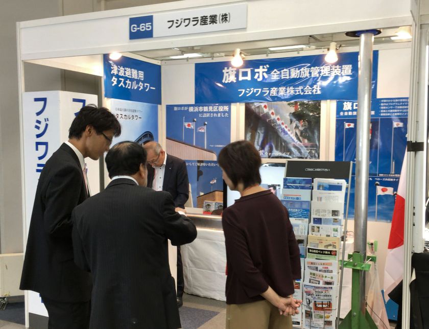 水処理装置および津波避難タワー等の各種防災設備・機器を開発・販売しているフジワラ産業株式会社(本社:大阪市、代表取締役:藤原 充弘)は、10月17日、18日に開催された『大阪勧業展2018』に旗自動掲揚・収納装置「旗ロボ」シリーズ(以下「本装置」)を出展しました。