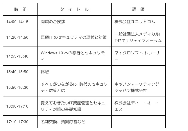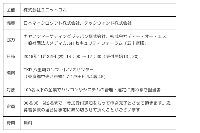 株式会社ユニットコム「医療機関におけるWindows 10 への移行とセキュリティセミナー」を東京 八重洲で2018年11月22日(木)に開催