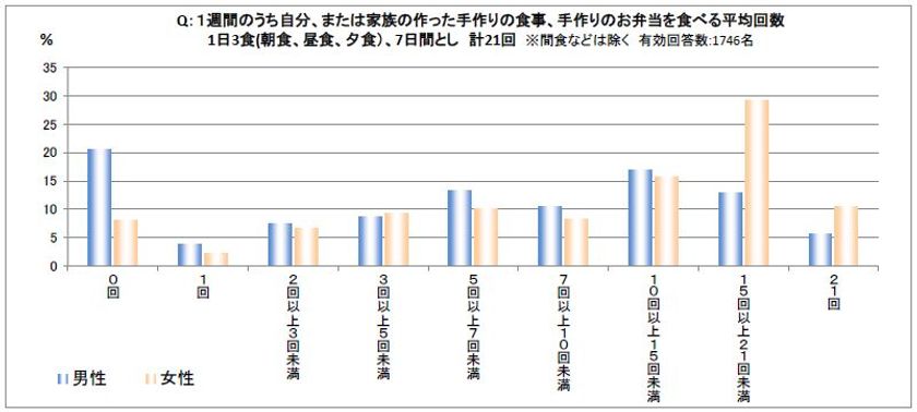 20代〜50代の有職者男女に1週間のうちの自分、もしくは家族の手作りの食事・お弁当を食べる平均回数(1日3食×7日間とし全21回)を聞いたところ、男性は、「0回」が20%でトップとなりました。特に20代、30代の男性が多く回答しました。女性は、「15回〜21回未満」が29%で一番多い回答に。毎日1日3食手作りの食事・お弁当を食べると回答した男性は5%、女性は10%でした。女性は手作りの食事を食べる機会が多い傾向にありましたが、男性は、なかなか手作りの食事を食べる機会が少ないようです。