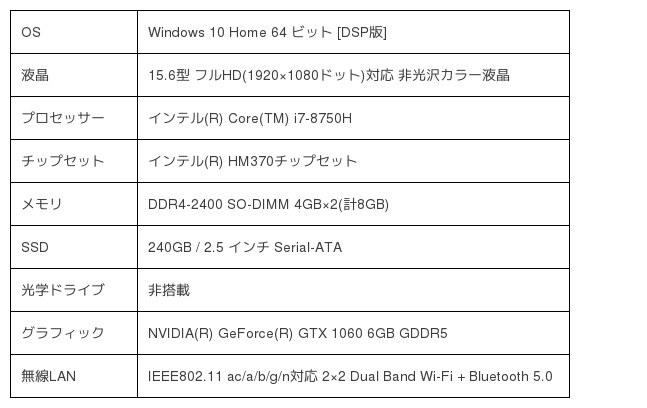 6 コア12スレッドの「インテル(R) Core(TM) i7-8750H」と「NVIDIA(R) GeForce(R) GTX 1060 6GB」を搭載し、15.6型のフルHD(1920×1080ドット)液晶を採用しております。快適で慣れ親しんだ作業環境を外出先に持ち出したいというニーズにお応えしたモデルです。