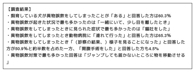 「飼育している犬が、異物誤飲をしてしまったことがありますか?」という質問に対して「ある」と回答した方は60.3%でした。今回の調査結果から、異物誤飲は、多くの犬で起こりうる事故であるということが分かりました。