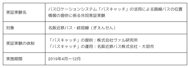 乗り換え案内サービス「駅すぱあと」を提供する株式会社ヴァル研究所(本社:東京都杉並区、代表取締役:太田 信夫)は、大垣市が行うスマートシティの実現に向けた共同実証実験プロジェクトに参加し、大垣市、名阪近鉄バス株式会社(本社:名古屋市中村区、代表取締役社長:松田 健)と共同で路線バスの位置情報提供に係る実証実験を2019年4月より実施します。