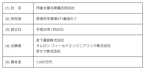 金下建設株式会社(本社:京都府宮津市、以下、金下建設)、オムロン フィールドエンジニアリング株式会社(本社:東京都目黒区、以下、OFE)、京セラ株式会社(本社:京都市伏見区、以下、京セラ)の3社が出資して設立したSPC(特別目的会社)の丹後太陽光発電合同会社(本社:京都府宮津市、代表社員:金下建設株式会社、職務執行者:荻野正彦、以下、丹後SPC)は、京都府宮津市、京都府舞鶴市、兵庫県豊岡市、福井県若狭町に合計7ヶ所の太陽光発電所(合計モジュール容量3,228kW)を開設いたしました。