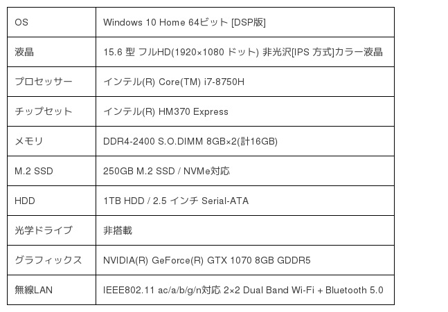 ■ インテル(R)Core(TM)i7とNVIDIA(R)GeForce(R)GTX1070搭載の15型フルHDノートモデル