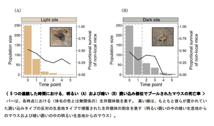 捕獲されたマウスをそれぞれ、明るい囲い地と暗い囲い地に入れ、14ヵ月後、生存率を求めたところ、明るい囲いと比較して暗い囲いの方が2倍高くなりました。明るい囲いでは、生き残ったマウスは元々の母集団の平均マウスより背側の色が平均して1.44倍明るかったが、暗い囲いでは平均して1.98倍暗くなりました。暗い囲い地では、アグチ遺伝子座の対立遺伝子頻度の変化が自然淘汰と一致していることがわかり、遺伝子レベルのパターンと表現型レベルの変化はパラレルでありました。背面の明るさと生存の間の有意な関連性が、顕著な色素沈着を有するマウスでは、より高い鳥の捕食率によって引き起こされる可能性が高いことを示唆されています。